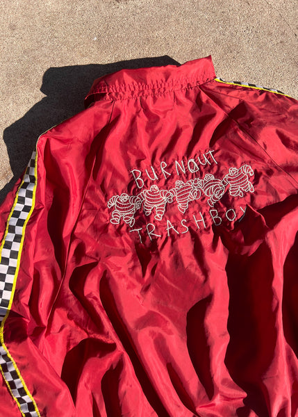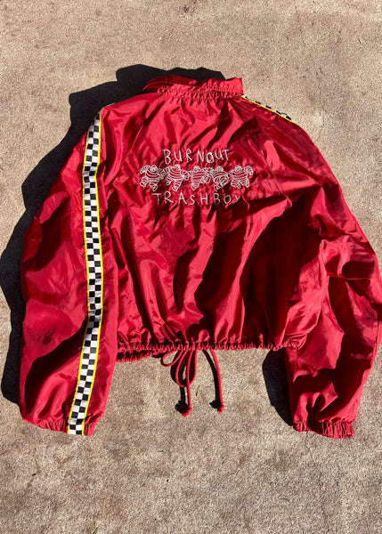 LIGHTWEIGHT VINTAGE NYLON JACKET EMBROIDERED WITH OUR BURNOUT TRASHBOY LOGO. WOMEN'S STYLE ADULT SIZE LARGE WITH A CROPPED HEM.