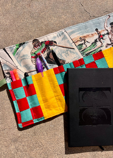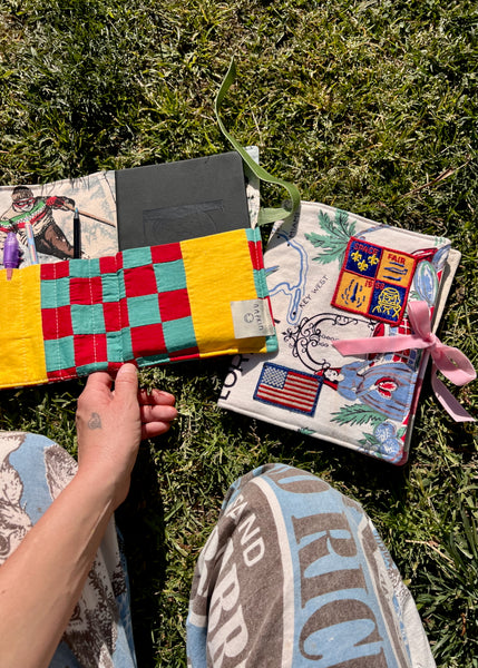 MADE WITH A VINTAGE QUILTS, 1970'S COCA COLA , ANTIQUE SPORTS FABRIC AND A FLORIDA TEA TOWEL. MEASURES 9 INCHES HIGH BY 15 INCHES ACROSS WHEN OPEN.